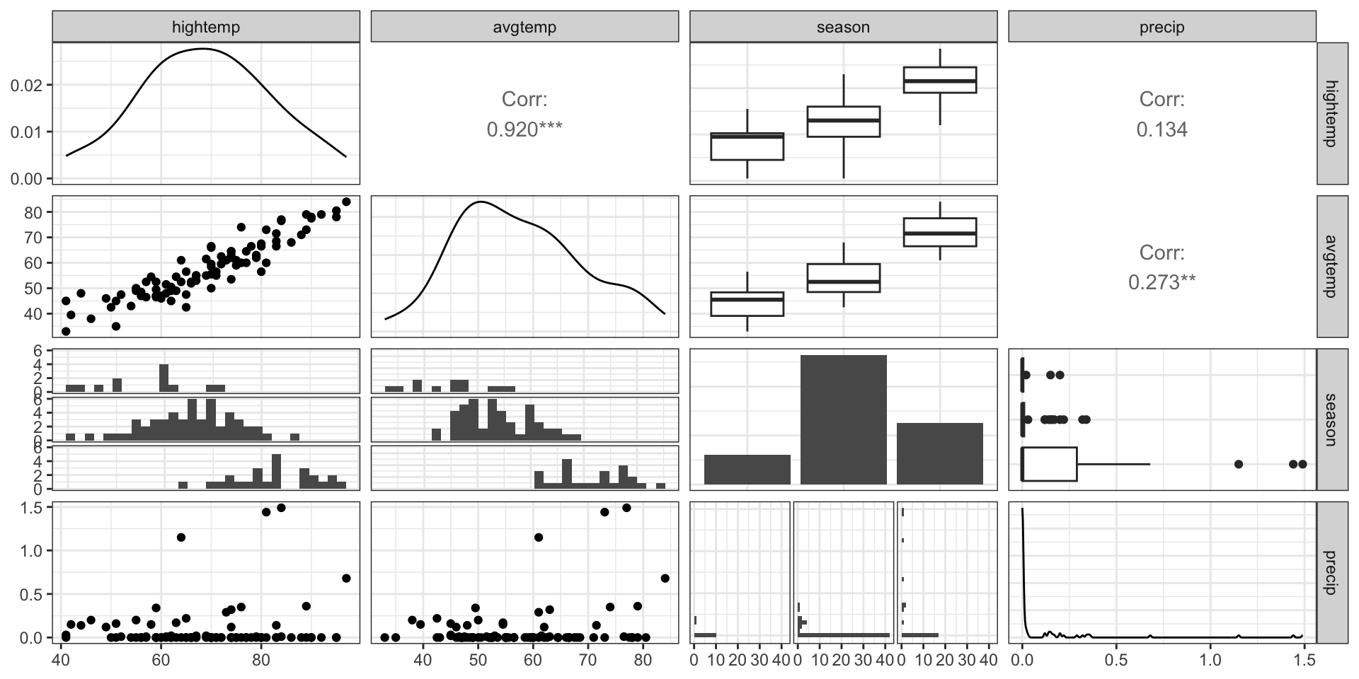 We can create a pairwise plot matrix using the ggpairs function from the GGally R package